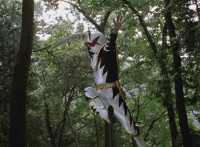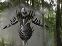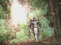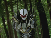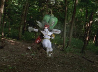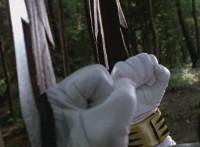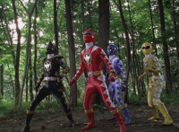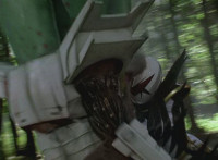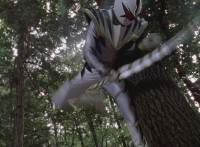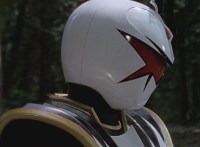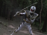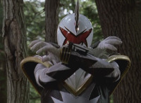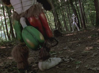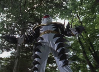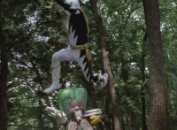 The four Rangers step up and watch, as White gets superspeed dashed a few more times, until he's flung into the air, hitting a tree, and falling down. Red speaks, Copyotter does too, as White recovers with ease. |