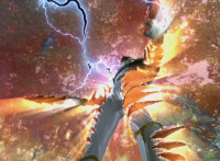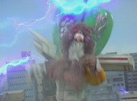A flash of light causes stormclouds to appear in the blue sky, raining suddenly, the purple glowing mass rises up and forms into a gigantic body with a flash of light. |