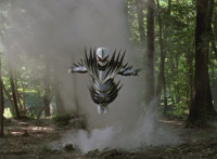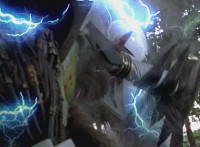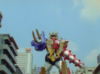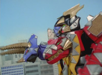 Tyrannozord transforms into the body, Tricerazord into the right arm, the head pops out, then the body leaps up and Pterazord locks on, before the helmet locks onto the head. Thundersaurus Megazord floats completed in front of an explosion. |