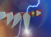 Triassic slashes downward on Evil White, spark bursting him profusely. |