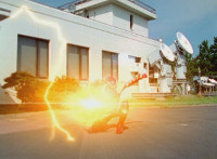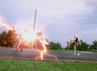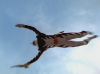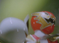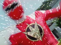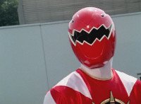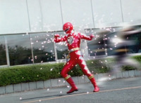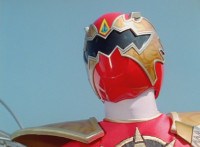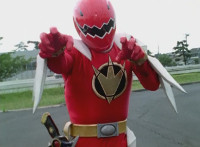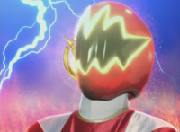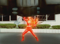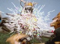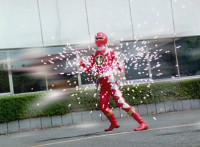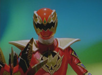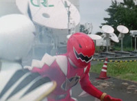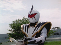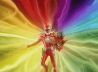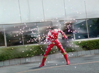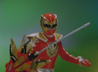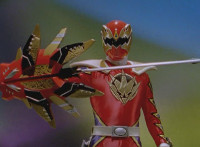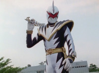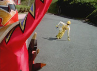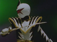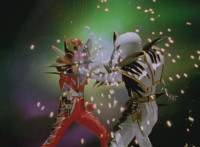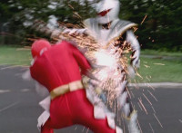 Evil White Ranger repeatedly streaks past Red, sparkily slashing him over and over again, until he grabs him and leaps forth. |