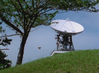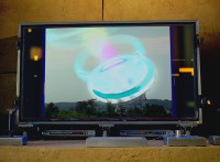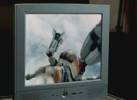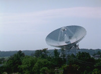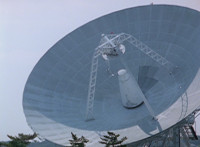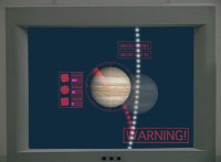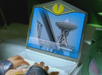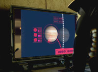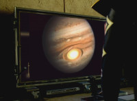 One of the monitors changes to show a schematic of the satellite dish, as the dish begins to lower, aimed at a new location in the sky. Jupitor's eye pulses, causing pulsing to fire from the dish into space, blasting from Earth toward the planet Jupiter. |