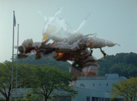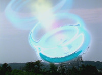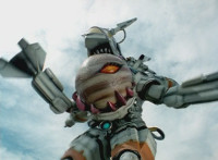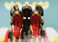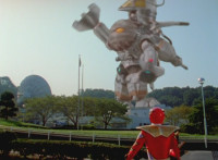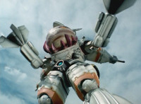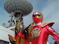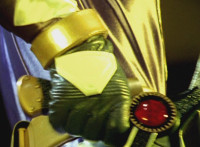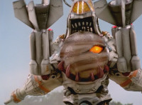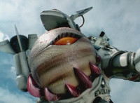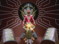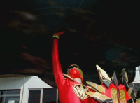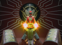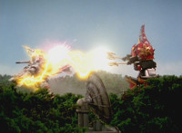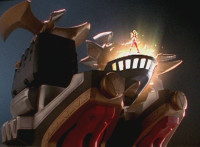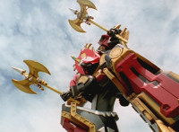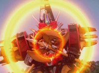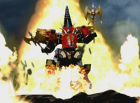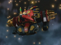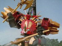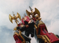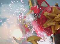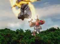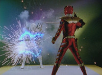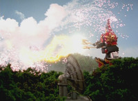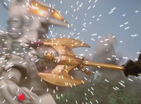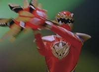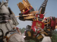Jupitor approaches and begins to fire lasers upon Mezodon Megazord, spark bursting it but not causing it to budge from where it stands. The Shield of Triumph glows, as Mezodon suddenly slashes its axes at Jupitor several times, finally knocking him back. Triassic's hands glow, Mezodon crosses its axes and fires golden energy at Jupitor, spark bursting him for a moment or two, before lifting him up into the sky and causing him to explode brightly. The planet Jupiter's great red spot then returns to normal. |