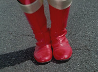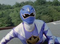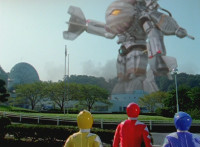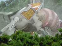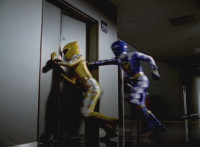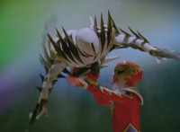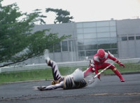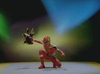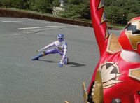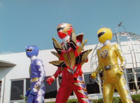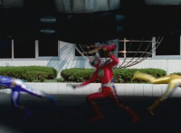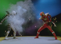 Jupitor stomps down on the three Rangers, Blue & Yellow rolling out of the way, but Triassic is crushed underfoot. Blue & Yellow react, as does the monster. |