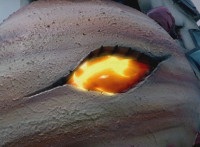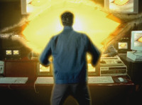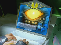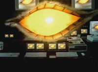 The controls begin to crackle with electricity, zapping the guy's hands off the keyboard, as the monitors all turn to close-ups of Jupitor's eye, which then appears gigantically before the standing guy. |