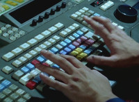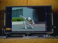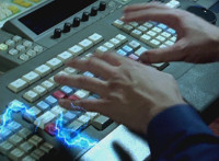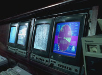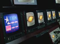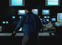 Video monitors in a control room suddenly turn to static, a Japanese employee turns and talks to a guy who come into the room with his back to us. |
