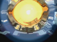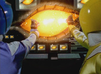 Yellow & Blue approach a closed door, pause to look at each other, then enter, where they find Jupitor's eye in the control room. They whip out their Triceramax Blasters and fire upon the eye, causing it to explode. |