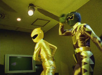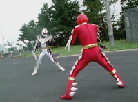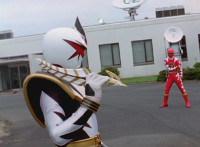 Evil White Ranger collapses onto his back as Red poses fiercely. Evil White recovers and talks. |
