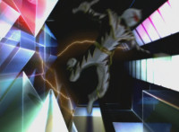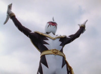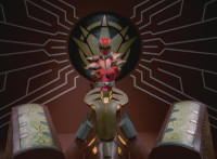 Triassic holds his hand forth, then uses his glowing shield to teleport himself and Evil White to the Triassic Dimension. Evil White falls in first, landing and turning around just as Triassic floats in and lands across from him on the platform, where they face one another. Evil White sheathes his Sword and activates his Super Dino Mode. He then readies his arm blades, speaks, then charges forth. |