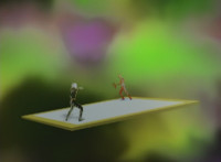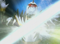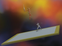 Triassic grabs Evil White and flips him over onto his back. He recovers just in time to see Triassic ready his Sword of Triumph, rushing over and sparkily slashing Evil White with it a few times, leaping over him and slashing once or twice more. |