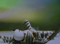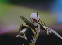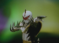 Locked in combat with Triassic, Evil White breaks off by slashing his armblade away from the Ranger, who then blocks his next two blows with his shield. Evil White undeterred, tries again to strike, but his arm blade gets grabbed by Triassic. |