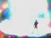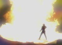 A bright, colorful explosion engulfs the scene, Triassic remaining untouched as he stands facing it. |