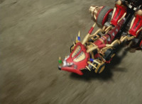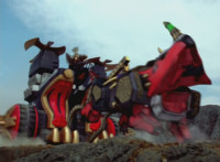 Mezodon Rover races along, with Styraco leaping into the air and detaching, causing the chariot to roll to a stop and its wheels and golden parts to teleport away. Styraco transforms and connects with the wheels, then connects with the chariot, forming the Mezodon Megazord, which poses with its weapons. |