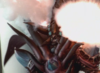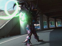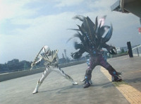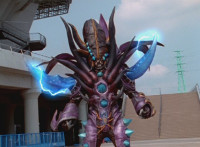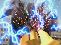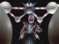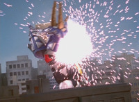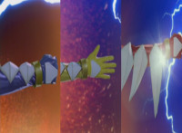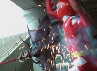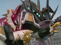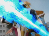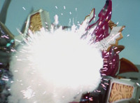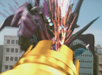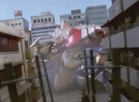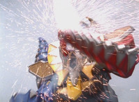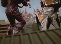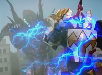 Thornox jumpkicks sparkily into Thundersaurus Megazord, then backflips and lands, where he begins to sparkily kick the Megazord repeatedly. |