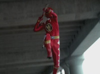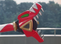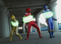 The three Rangers rush up, looking upward, then Red turns and summons into his Morpher. |