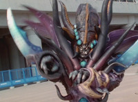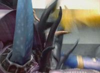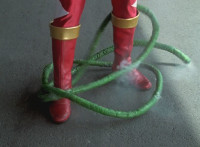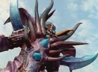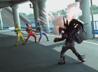 Thornox twirls an energy whip around and flings it at the three Rangers, wrapping around them and forming into green vines which bind around their arms. Blue struggles, Yellow speaks, then Red reaches his holstered Thundermax Blaster, firing it at Thornox, as do his teammates, bursting him. His binds dropped, Red whips his Tyranno Staff around and leaps forth with it, only for Thornox to grab it, jerk it out of Red's hands, then use it against Red sparkily! He's flung across the courtyard, where his teammates regroup around him. Thornox then places a purple golf ball on a tee, and uses the Tyranno Staff as a golf club. Each Ranger reacts, as he swings the staff and shoots the balls at each of them explosively. |