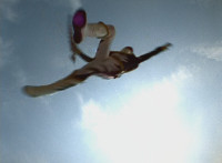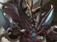 Stormclouds appear in a blue sky, raising suddenly, then as they dissipate, a purple glowing mass rises up and forms into a gigantic body with a flash of light. |