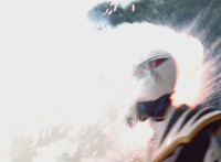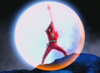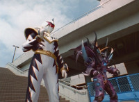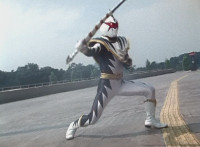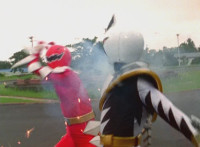 Yellow and Blue kick Thornox repeatedly as he sparks. Evil White rolls and recovers, guarded. Red readies his Tyranno Staff, does the full moon gesture power up thing, then slashes the energy orb at Evil White, who bursts when being hit by it. |