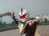 Thornox regroups with Evil White, as they face the regrouped Rangers. Evil White clenches his fist and responds. Red speaks as the shot pushes in on him. |