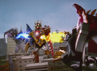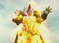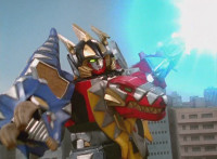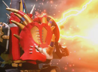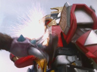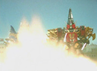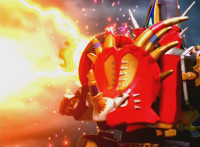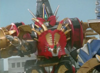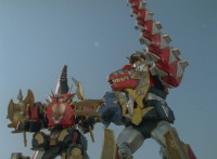 Tyrannozord transforms into the body, Tricerazord into the right arm, the head pops out, then the body leaps up and Pterazord locks on, before the helmet locks onto the head. The Thundersaurus Megazord floats completed in front of an explosion. |