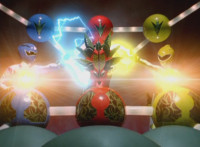 Each Ranger leaps up and merges into the forehead of their respective Dinozord. |