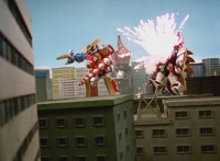 Thundersaurus & Mezodon step forth and energy strike Thornox & Dino Stegazord as they pass, bursting both. |