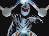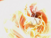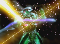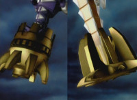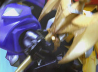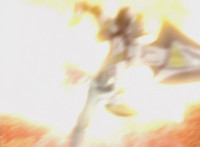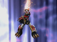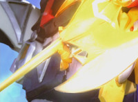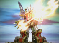 Triceramax points its right arm forth, and begins to fire golden blasts of energy from it while its left arm spins. |
