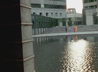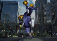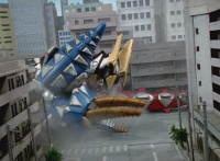 Stegozord walks through the city, soon transforming into the Stega Surfboard. |