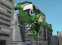 Brachiozord opens up his compartments, revealing the main three Dinozords inside. Tyrannozord races out of the side compartment. Pterazord flies out of the front compartment, and Tricerazord marches down Brachiozord's neck. |
