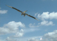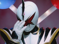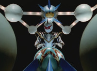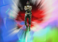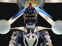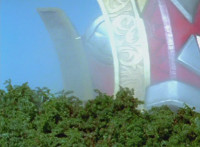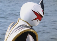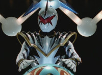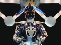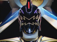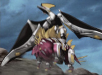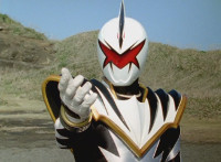 Stegozord turns and roars, Evil White looks upward, as White Dragozord turns his head, then takes off into the sky. Evil White watches, then begins to stagger forth again, soon teleporting away. |