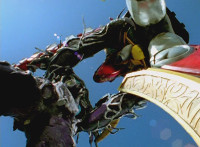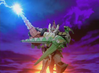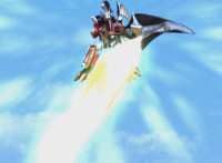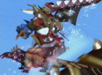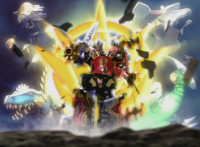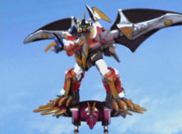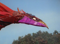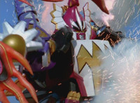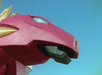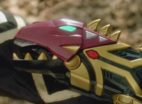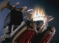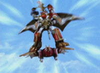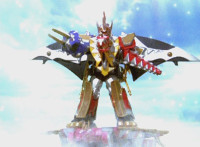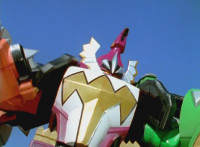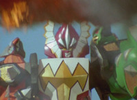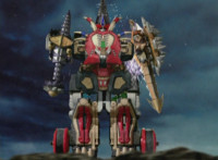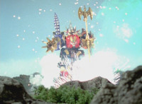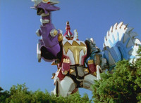 Tricerazord into the right arm, the head pops out, then the body leaps up and Pterazord locks on, before the helmet locks onto the head. Thundersaurus Megazord floats completed in front of an explosion. |