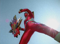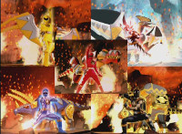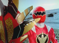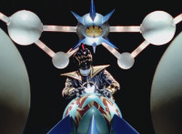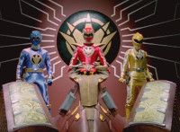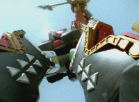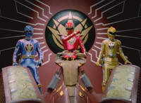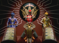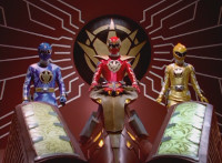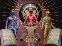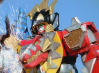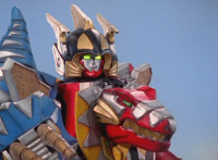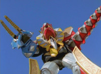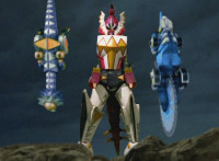 Red turns and speaks forth, as Thundersaurus connects with White Dragozord and lands on the Stega Surfboard. The Mezodon Rover lends its golden weapons and helmet, forming the Valkasaurus Megazord, all five Rangers in the cockpit. |
