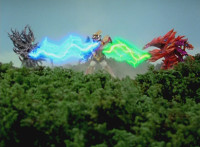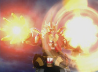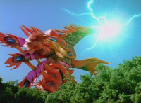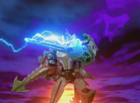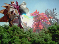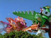 Drago flies past Skortch, bursting him with his wing. Deadwood & Thundersaurus clash, the monster sparkily hitting the Megazord in the chest. |