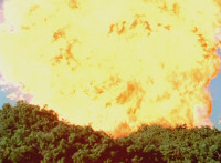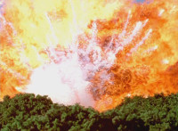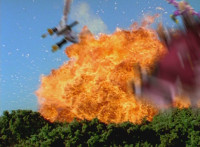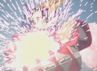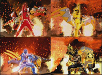 Black struggles in the crackling cockpit, as Dino Stegazord crackles, collapses, and explodes massively, sending the four Zords flying. |