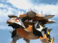 Styraco transforms and connects with the wheels, then connects with the chariot, forming the Mezodon Megazord. |