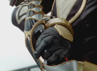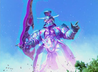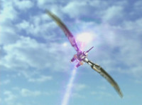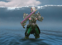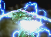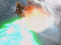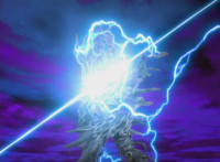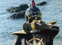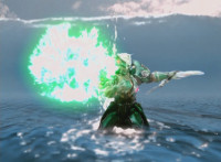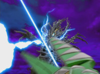 Black whips out his Brachio Staff, poses with it, then stabs it into the ground, releasing energy, which causes a tidal wave to rise up in the nearby ocean, rising up behind Jade Gladiator, who remains calm. |