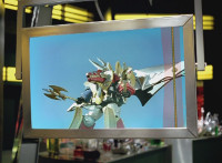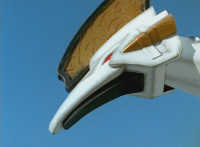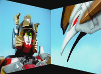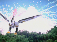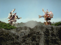 White Dragozord shrieks, Stegozord roars, as both fly up into the sky and transform into component body parts. Dino Stegazord comes together, then poses completed in midair. |