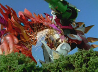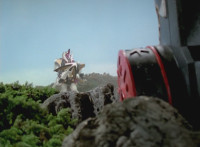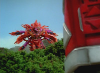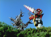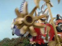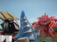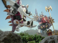 Cuts follow-ups of Thundersaurus & Dino Stegazord taking on plant. |