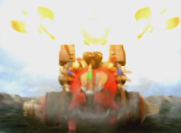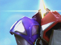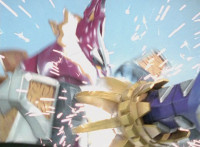 Dino Stegazord charges forth, so Triceramax sparkily punches it in the chest, knocking it over. |