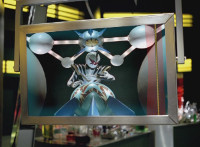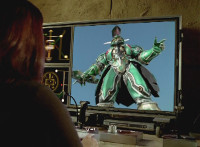 Altered to fit viewscreen; cuts follow-ups of him talking to his Morpher, which talks back and changes to Stego faceplate. |