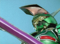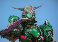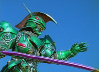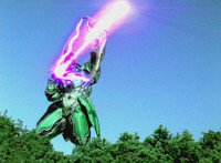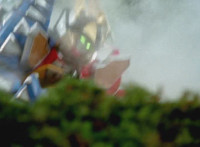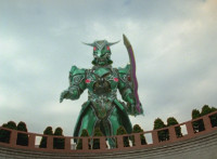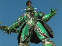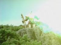 Jade Gladiator readies his saber, and flings forth a burst of green energy, which bursts and explodes Thundersaurus, shaking up the cockpit. The monster then poses victoriously. |