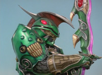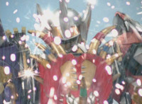 Red lifts up his Shield of Triumph and talks, and as Black watches, Blue & Yellow pour their energies into the Shield. |