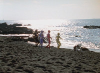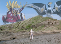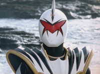 Evil White staggers across the beach as Stegozord and White Dragozord stand in the horizon. |