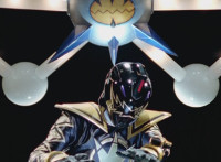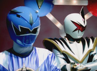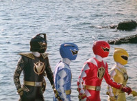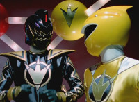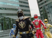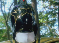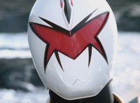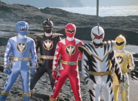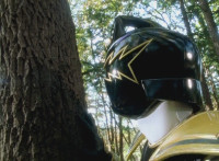 Evil White collapses, as the other four Rangers approach from behind. Red speaks, Evil White shakes his head and sits up, Yellow replies, then Evil White stands up and walks off. |