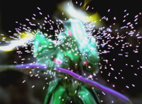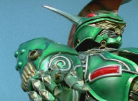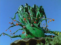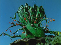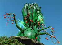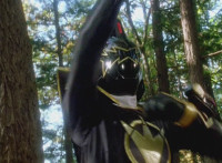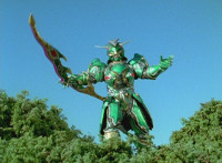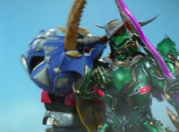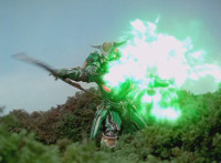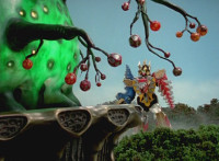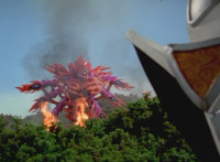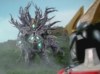 Jade Gladiator suddenly morphs into a giant green plant, Thundersaurus reacting, as do the Rangers within, and even Black in the woods below. The plant suddenly fires off a pair of glowing spores that form into a resurrected Deadwood Monster and another giant monster we've never seen before named Skortch, standing on either side of the Megazord. |