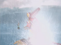 The Megazord lands in the water on its Surfboard and heads toward the monster. |
