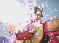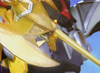 The golden energies strike Dino Stegazord explosively, Evil White shaken for a second, then regains his composure. |