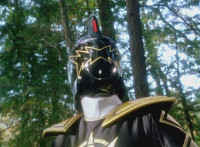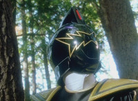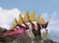 Brachio Morpher's faceplate changes to that of Stegozord, as said Stego walks across the landscape. Black looks up, then leaps up and merges with Stegozord's forehead. |