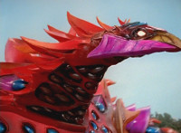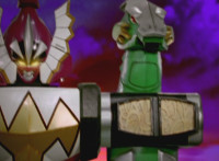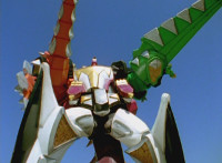 Jade Gladiator fires energy arrows up at White Dragozord, who spins and dodges them. While he's distracted, Thundersaurus comes over and shoves the monster down, the Megazord then looking up at the Drago shrieks. Slow zoom in on Red nod-talking a lot to our upper right, then White responds. |
