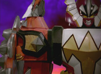 Black speaks in the cockpit, as Cephala and Dimetro become Dino Stegazord's new arms, posing with them, only to get blasted by Skortch. |